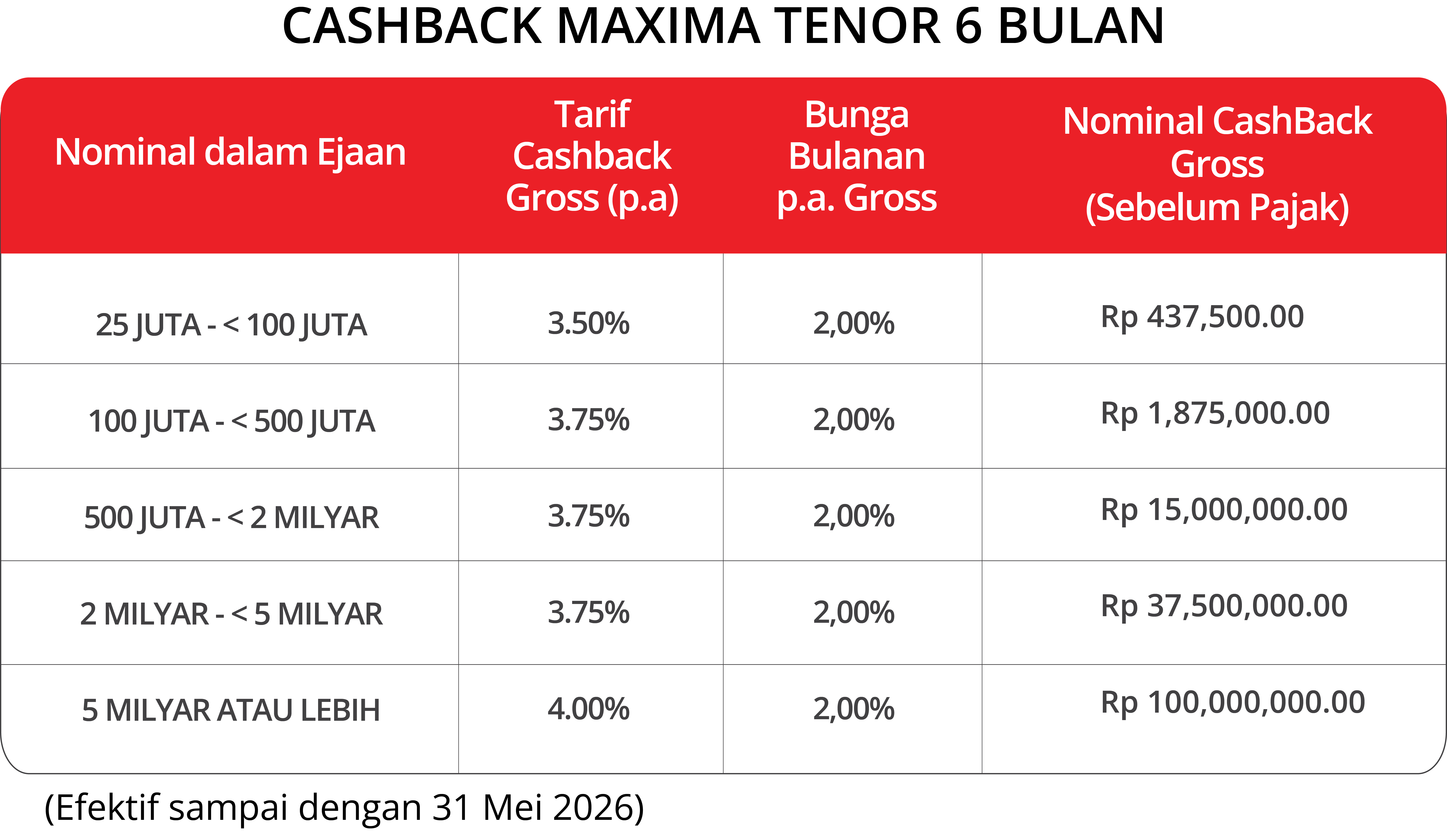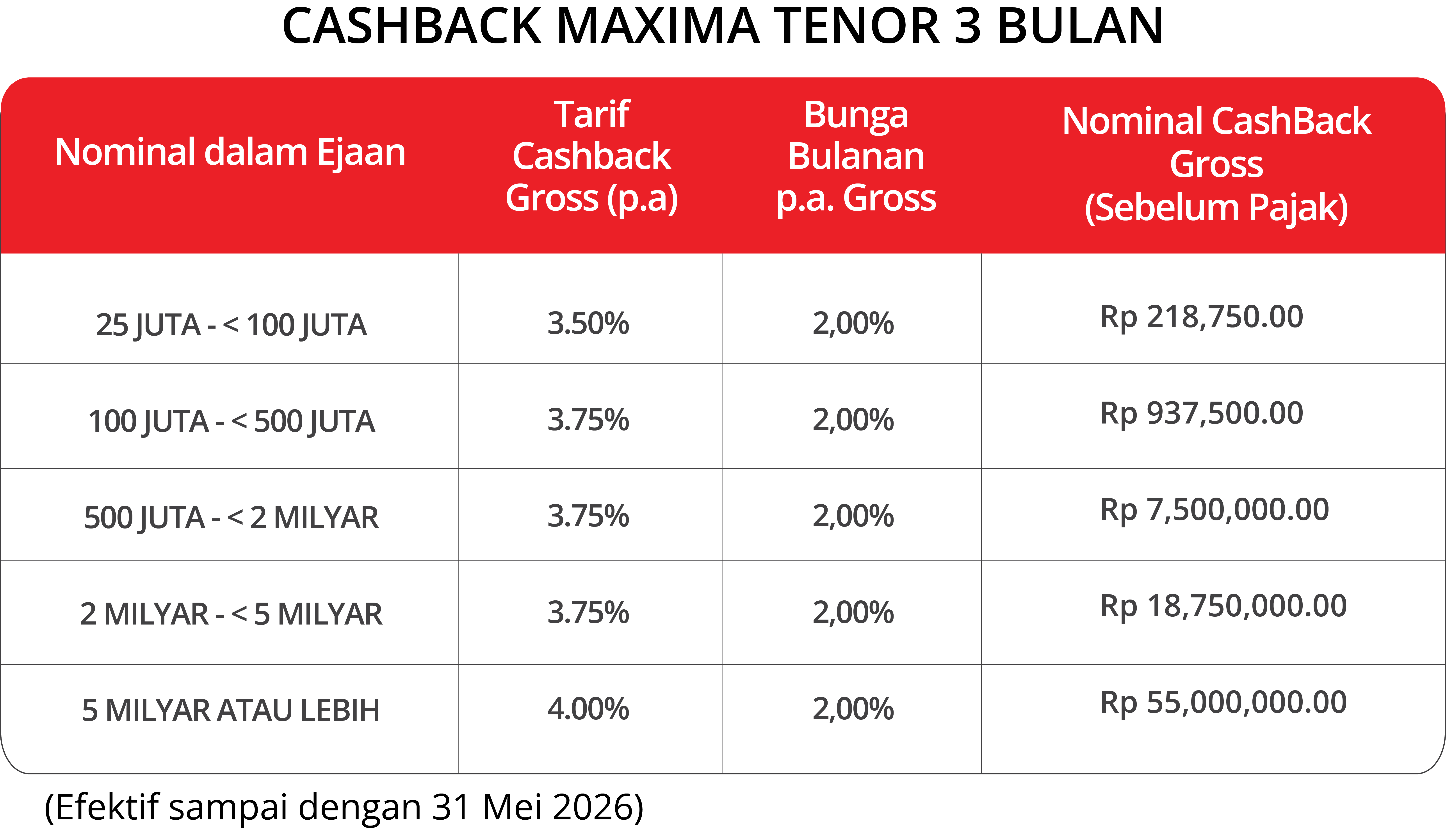 - Penarikan dana sebelum jatuh tempo, maka akan dikenakan pinalti sebesar nominal cashback